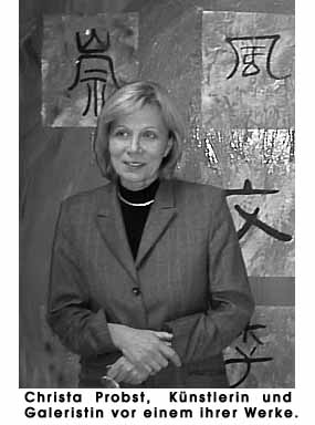 "Kunst gegen Hektik und Stress"München den 8. 1. 2001 Wer denkt, Kunst und Arbeitswelt wären zwei verschiedene Dinge, sollte die CPgallery in Haidhausen besuchen. Christa Probst Galeristin und selbst Künstlerin ist seit ihren Aufenthalten in China davon überzeugt, dass Kunst auch bei uns einen wichtigen Stellenwert im Geschäftsambiente einnehmen sollte. Nach dem asiatischen Vorbild wird hier davon ausgegangen, dass durch ein harmonisches Umfeld eine kraftspendende kreative Quelle erzeugt wird. Firmen können sich von der Galeristin und Malerin beraten lassen und aus ihren Werken oder den Arbeiten der Künstler die sie vertritt die Stilrichtung wählen, die der eigenen Unternehmensdarstellung am besten entgegenkommt. Auf die jeweilige Raumsituation abgestimmt wird dann die Kunst von ihr in Szene gesetzt und ein meditativer Ruhepol im oft hektischen Arbeitsumfeld geschaffen.