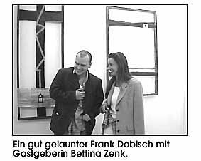 ![]() ![]() | "Landschaften II"Ein malerischer Schwabinger Hinterhof war Schauplatz der aktuellen Frank Dobisch Ausstellung "Landschaften II". In den Räumen der Kommunikationsdesignerin Bettina Zenk wurde zu einer opulenten Eröffnungfeier geladen, und natürlich erschien die Szene zahlreich. Neben dem Buffet und offenem Wein vom Fass überzeugten vor allem die, wieder stark graphisch orientierten, collagenhaften Werke des vielseitigen Künstlers. Schade eigentlich nur die kurze Ausstellungsdauer von drei Tagen, aber die Pflichten als Artention-Chefredakteur rufen Frank Dobisch dringend an den Schreibtisch zurück. Mehr zu Frank Dobisch siehe auch... © universal arts - Verwendung nur im Rahmen unseres Lizenzmodells Photos: universal arts |