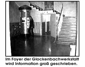 "Raum für Kunst"München den 12. 11. 1998 Die allseits bekannte Misere, daß unbekannte Künstler kaum Ausstellungsmöglichkeiten finden, erfährt durch eine, von der Stadt unterstützte Initiative ein wenig Linderung. Die Macher der Glockenbachwerkstatt, einem Bürgerhaus, haben sich vorgenommen, in ihrem Stadtteiltreff einen ständigen Ausstellungsbetrieb zu realisieren. Neben Bildender Kunst sind hier auch Performance und Installation möglich. Die Künstler werden darüber hinaus auch bei Einladungsgestaltung und Pressearbeit aktiv unterstützt.