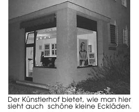 "Historische Begegnung"München den 7. 2. 2002 Seit Ende 2000 hat der, von vielen Kreativen als Wohn- und Arbeitsraum geschätzte, historische Münchner Künstlerhof eine neue Galerie. Die diplomierte Kunstgestalterin und Galeristin Natascha von Fern hat sich nicht mehr und nicht weniger als die Neugestaltung des, 1928/29 von Sepp Frank mit Fresken ausgestatteten Siedlungskonzeptes, einer Mischung aus Wohnungen und Ateliers mit gräumigem Innenhof, vorgenommen.
