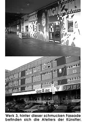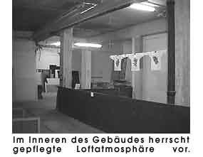 "Werktag 2000"München den 19. 11. 2000 Nur wenige Kilometer vom Stadtkern entfernt befindet sich Münchens bekannteste Hallenkultur- und Partymeile, der Kunstpark-Ost. Hauptbestandteile des ehemaligen Geländes einer Kartoffelverarbeitungsfabrik sind die Nachtlokalszene und die Flohmarkthallen. In dieser Jahrmarktsatmosphäre wird man, nach einigem Suchen, auch tatsächlich in Sachen Kunst fündig. Das, vergleichsweise unscheinbare Gebäude, in dem sich die Künstlerateliers befinden hat eine stattliche Grösse, aber man muss als Besucher erst einmal die zwar zahlreichen, jedoch kleinen Eingänge des "Werk 3" ausfindig machen. Am 19. November war es dort wieder einmal so weit, die rund 30 Künstler öffneten unter dem Motto "Werktag 2000" ihre Ateliers. In den, zum Teil recht eindrucksvollen Räumen auf drei Etagen präsentierte man Malerei, Installation, Fotografie, Design, Multimedia, Mode und Keramik. Die Riege der Fotografen zeigte durchwegs ansprechende Arbeiten, hier gab man sich auch hinsichtlich der Präsentation Mühe.