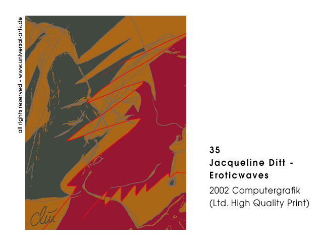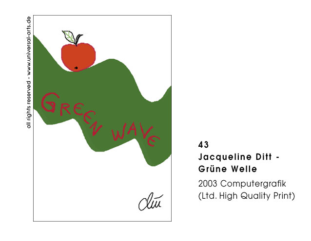 Die Ausstellung "Waves" von Jacqueline Ditt beschäftigt sich thematisch mit dem verschiedenen Auftreten des Wortes Welle oder Wave. Ob direkte Bedeutung oder im übertragenen Sinn, die Malerin und Grafikerin Jacqueline Ditt setzt die verschiedensten dieser Wortschöpfungen in Bilder bzw. Szenen um. Mittels Collage, Strichzeichnung, Typografie und Computertechnik entwickelt sie ihre typische Bildsprache. Um das Ergebnis von der virtuellen Ebene auf die Reale zu transponieren werden diese Computergrafiken als High Quality Prints in limitierter Auflage gedruckt.
