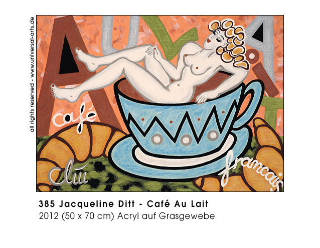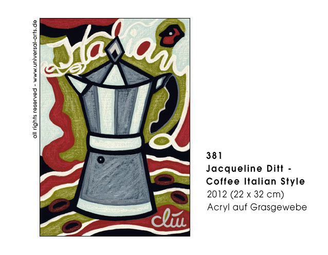 Heute bedeutet Koffein Kapsel-Kaffee oder "Coffe To Go" im Plastikbecher, auch stylische Kaffeemaschinen sind absolut "kultig". Geschwindigkeit ist das Zeichen der Zeit und dieser "legale Stoff" ist die Nummer eins für einen perfekten, raschen Tages- und Arbeitsablauf. Aber der Konsum hat eine lange Tradition, in vielen Kulturen kennt man die Benutzung schon von alters her und Koffein ist auch Inhaltsstoff von verschiedenen anderen Pflanzen, zum Beispiel schwarzem und grünem Tee. Kaffeehäuser waren Plätze um Konversation zu pflegen und die Teezeit oft eine Zeremonie. Natürlich ist die Frage "Kaffee oder Tee" auch Geschmackssache aber ungeachtet dessen was die Leute bevorzugen so ist es wohl kein Genuss das Getränk, wie heute in Hast zu konsumieren. - Ausstellung 2012 - "Coffein" 12 Gemälde von Jacqueline Ditt.