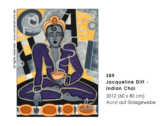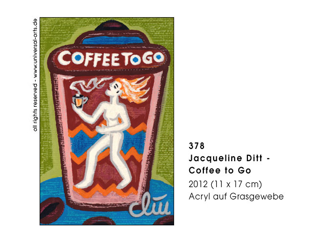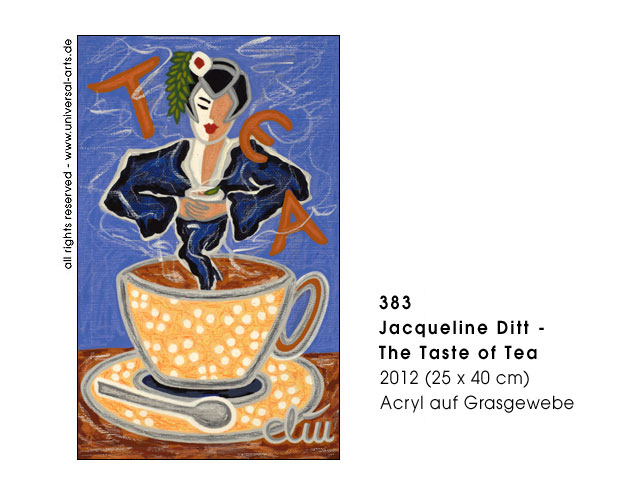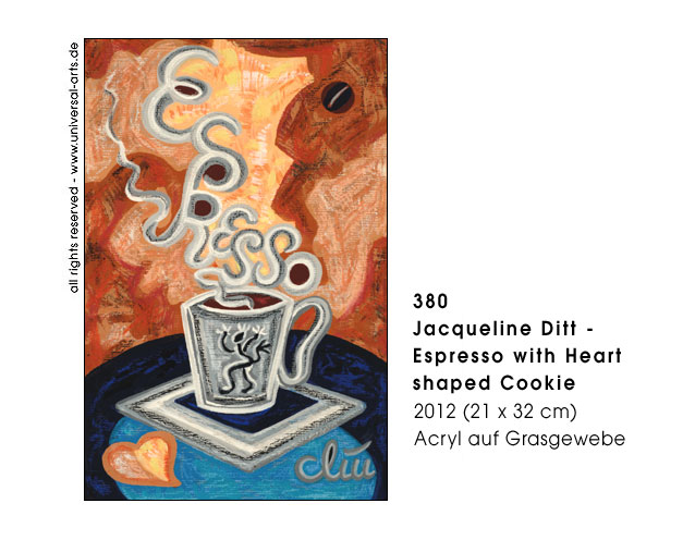 Today caffeine means capsule coffee or "coffe to go" in plastic cups, even a stylish coffee machine is seriously "cult". Speed is the sign of the time and this "legal substance" is the number one for the perfect daily routine and a fast workflow. But the consumption has a long tradition, in many cultures it's used from ancient times and caffeine is also ingrediant of different other plants, for example black and green tea, coffe houses were places for conversation and teatime often was a ceremony. Naturally the question "coffee or tea" is also a matter of taste and regardless what people prefere it's not a pleasure at all to consume it in haste as nowadays. - Exhibition 2012 - "Coffein" (caffeine) 12 paintings by Jacqueline Ditt.