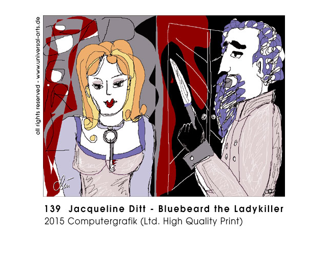 rich, often kings if they are elder, or heroes and brave knights. All this "Fairy stuff" is undoubtedly entertaining and sometimes even instructive, so the artist doesn't want to change them in substance but they are what they are very popular "old stories" and in relation to tradition in stereotypes we should rather turn to emancipation. - Exhibition 2015 "Fairy Tales - Reloaded" - 7 paintings and 2 graphics by Jacqueline Ditt